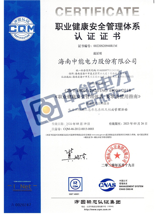 职业健康安全管理体系认证证书